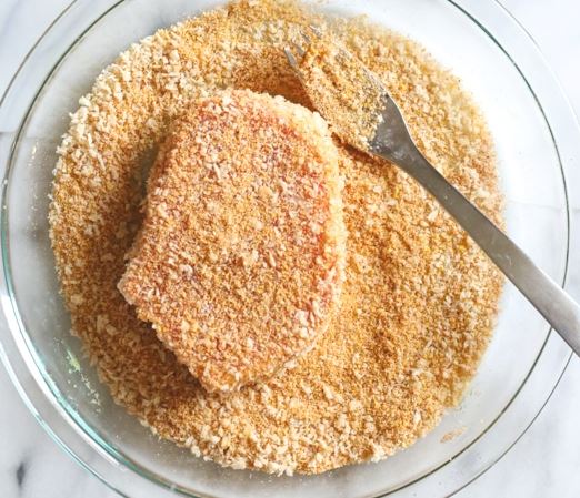 Place the beaten egg in another. Dip the pork into the egg, then crumb mixture.