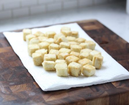 Place half of the tofu in single layer in air fryer basket, and cook at 375°F until crispy and golden brown, about 15 minutes, turning tofu cubes over halfway through cooking. Keep warm in preheated oven while cooking remaining tofu.