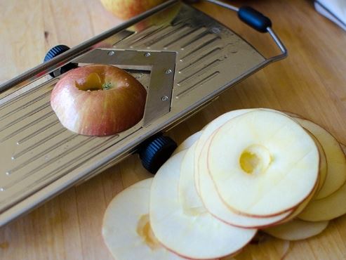 Thinly slice apple on a mandolin. Place slices in a bowl with cinnamon and oil; toss to coat evenly.