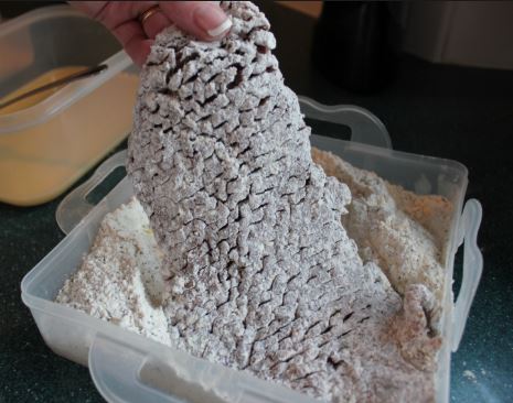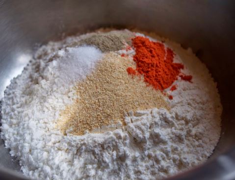 Beat Egg. Mix together flour, garlic powder, salt, and (if you want spice) Cayenne pepper or Slap Ya Mama seasoning