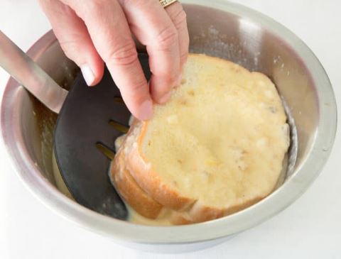 Cut out a piece of aluminum foil about the same size as the bread and brush the foil with melted butter. Dip both sides of the sandwich in the egg batter. Let the batter soak into bread for about 30 seconds on each side. Then place the sandwich on the greased aluminum foil and transfer it to the air fryer basket. For extra browning, brush the top of the sandwich with melted butter. Air-fry at 350ºF for 10 minutes. Flip the sandwich over, brush with butter and air-fry for an additional 8 minutes.