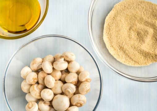 Wash the mushrooms and pat dry with kitchen paper. For each roll the mushroom in the flour, next, dip the mushroom in the egg and dip the mushroom in the breadcrumbs/cheese mix, ensure a good but even coating.