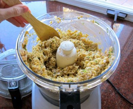 Place the Soaked Chickpeas, roughly chopped Onion, and Garlic into a large Food Processor. Process until the mixture is finely chopped, but not mush.