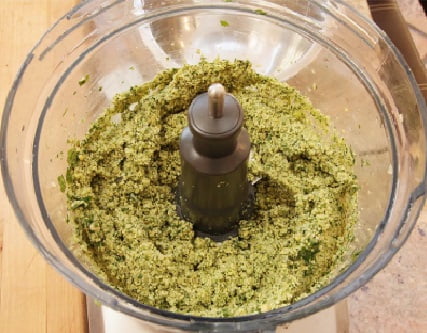 Next, add in the fresh Herbs, dried Spices, and Lemon Juice. Process again until well incorporated — the mixture should turn a bright green color.