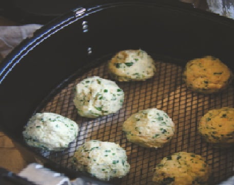 Transfer the Falafel balls to the Air Fryer basket and Bake at 350F for 20 minutes. For extra crispy Falafel, spray the balls with some oil or a nonstick cooking spray before baking.